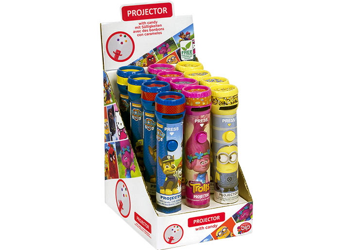 Un projecteur d’image nouvelle génération : en tournant la molette on fait défiler 5 images différentes ! Le manche du projecteur est rempli de délicieux bonbons dextrose. Pour lancer ce concept, l’association des 3 licences les plus fortes du moment : MINIONS (nouveau film à venir) , TROLLS et la célèbre série PAW PATROL , réunie au sein d’un même display.