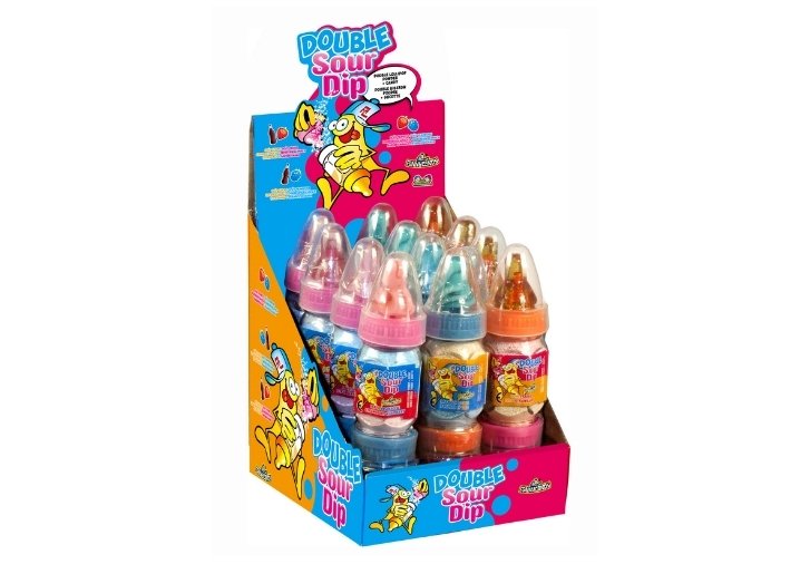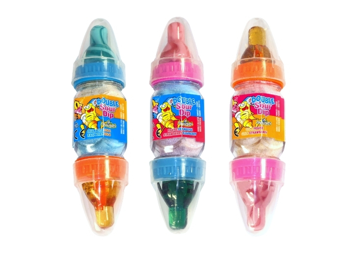 Découvre DOUBLE SOUR DIP par FUNNY CANDY ! La double sucette-biberon remplie de poudre acidulée.