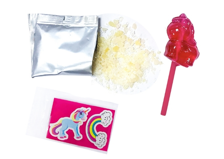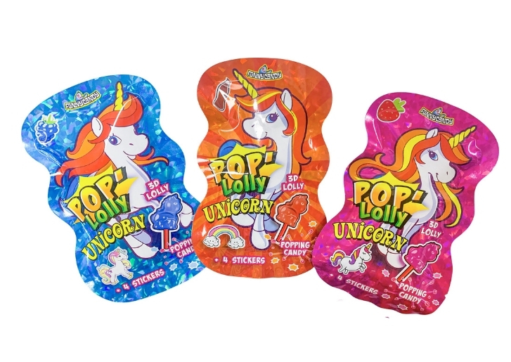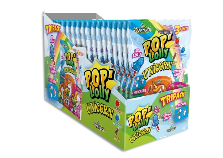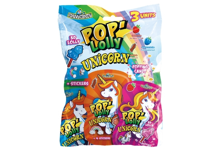 Découvre POP LOLLY UNICORN par FUNNY CANDY, la sucette 3D licorne à tremper dans la poudre claquante ! Elle crépite sur la langue ! Chaque sachet contient aussi une bande de 4 autocollants licorne, avec 3 bandes différentes à collectionner. Le tripack contient 3 sachets à partager, aux goûts fraise, framboise et cola.